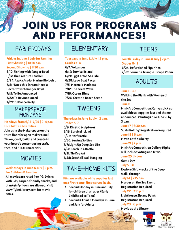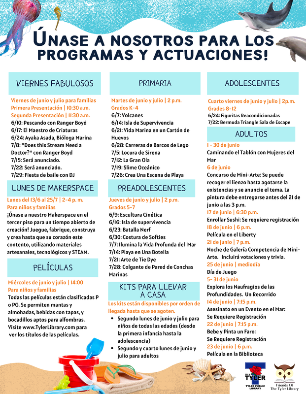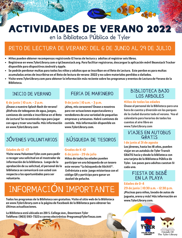 La biblioteca pΓΊblica de Tyler tambiΓ©n estΓ‘ organizando eventos gratuitos y divertidos durante todo el verano y los estudiantes de Tyler ISD pueden obtener una cuenta de la Biblioteca PΓΊblica de Tyler sin necesidad de comprar una membresΓa debido al estado de no residencia. Para obtener una tarjeta de biblioteca, visite la biblioteca en 201 S. College Avenue en el centro de Tyler durante el horario de atenciΓ³n actual. Debe traer prueba de inscripciΓ³n o su identificaciΓ³n de estudiante.