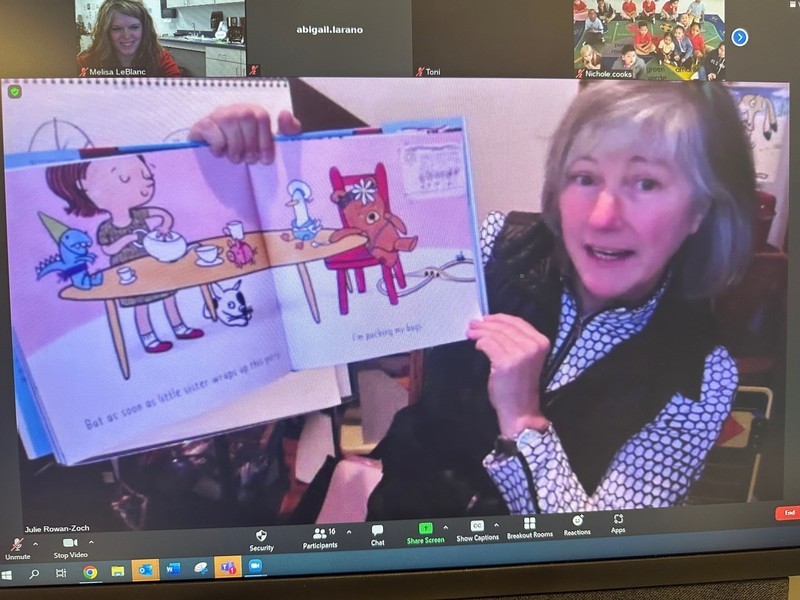Ms. Rowan-Zoch began the zoom meeting by sharing a read aloud of her Texas 2x2 honor book, Louis, that she illustrated with author Tom Lichtenheld. Louis is the adorable story of a beloved bear who plots his escape from his suffocatingly affectionate owner. She pointed out the little known hidden meanings in the illustrations that she planted, including the pet goldfish, an homage to her one and only childhood pet, and the red cereal bowl that matched her own.