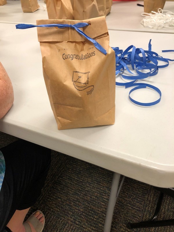 They filled sacks with popcorn, Caprisun, a package of cookies, candy, and a DQ coupon for free ice cream. They were handed out to each graduate celebrating this momentous occasion.