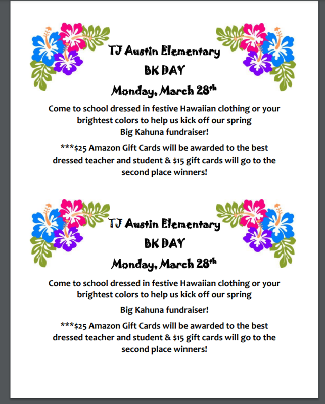 Our TJ Austin Elementary of Tyler PTA will be conducting a school fundraiser. Students who participate will be provided a kit that has assorted candy bars and cookies for $2 each. Students that sell a total of 3 kits or siblings who sell 4kits will get to participate in the Monster Party Limo Experience. The kick-off to the fundraiser will be March 28th (7:55 AM in the gym) and we encourage all students to wear festive Hawaiian clothing or bright colors.