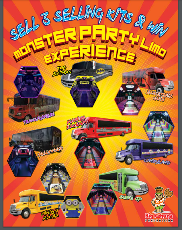 1. Students who sell 3 kits (siblings who sell 4 kits) or more will be able to join the Monster Party Limo Experience.
