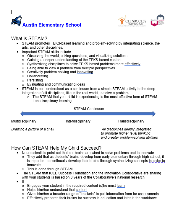 All T. J. Austin parents and families will be invited to learn and experience STEAM as our students kick off their STEAM projects.