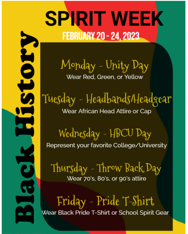 Additionally, we will have Black History Spirit Week Dress-Up February 20-24, 2023. Review the image above for more information.